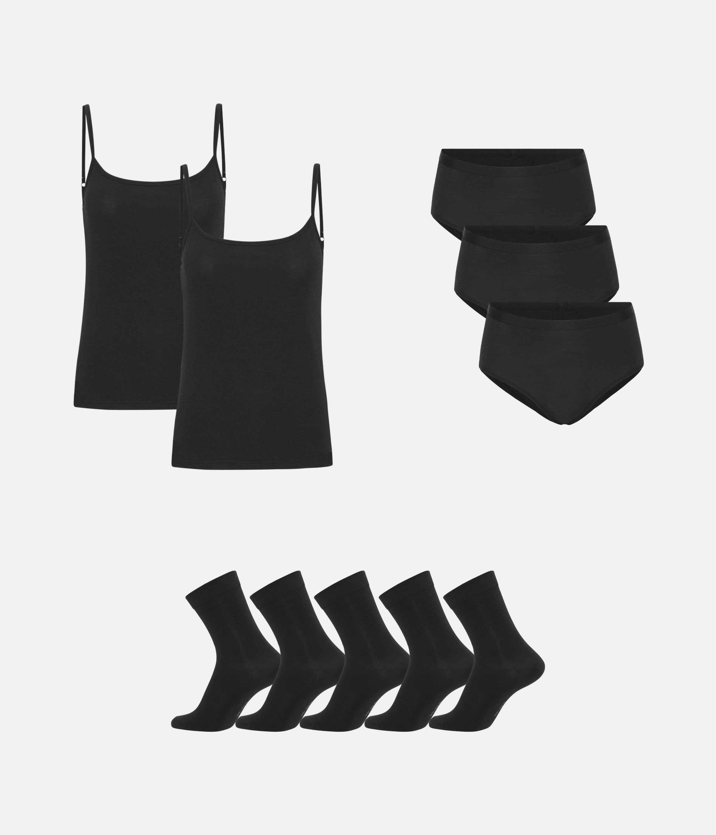 Denne bambus pakke til damer indeholder to toppe, 3 par maxi trusser og 5 par strømper i sort fra Copenhagen Bamboo. Alle produkterne er lavet i bambusviskose og er derfor åndbar og temperaturregulerende, hvilket gør det ekstra behageligt at have på.