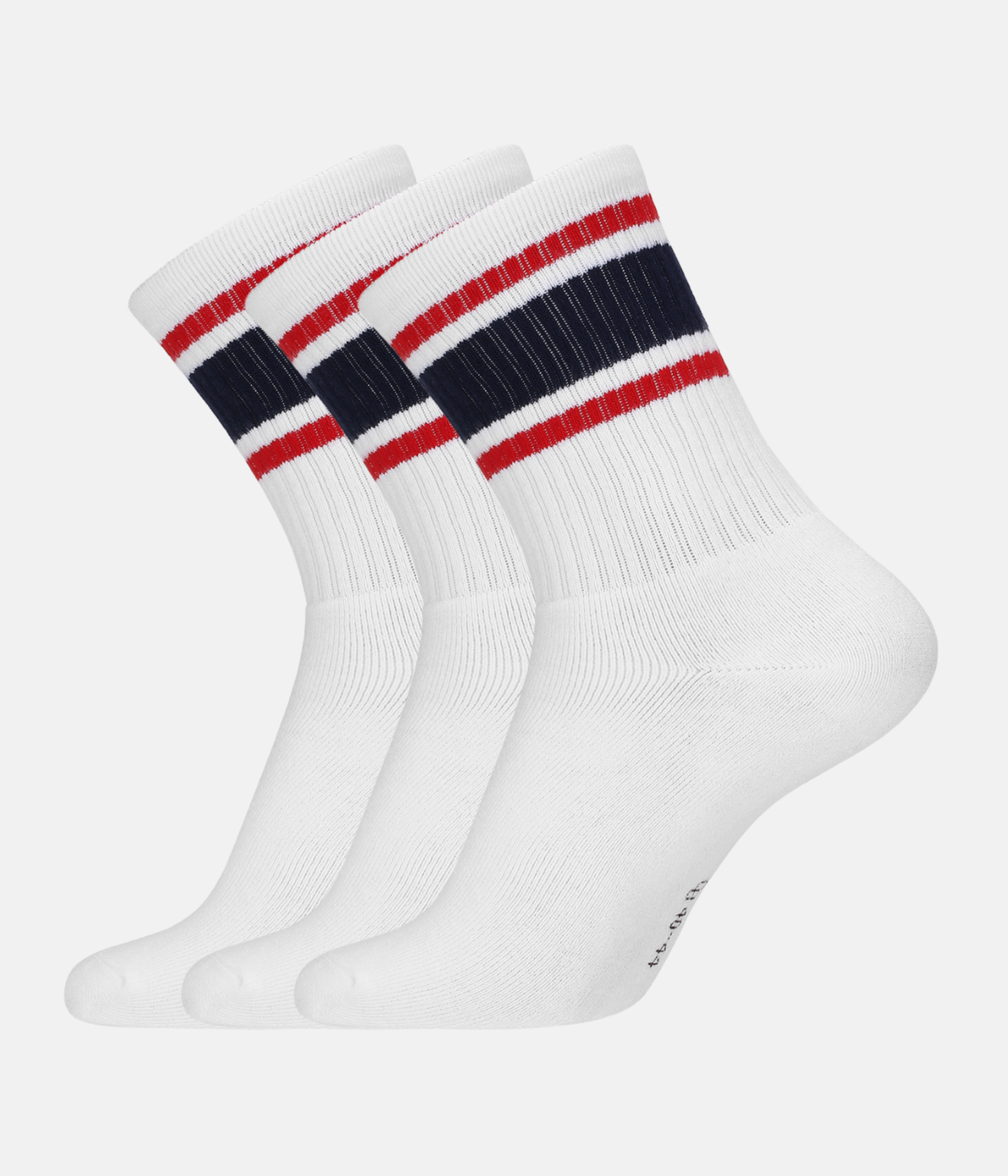 3 par hvide bambus tennissokker med blå/rød striber og lang rib