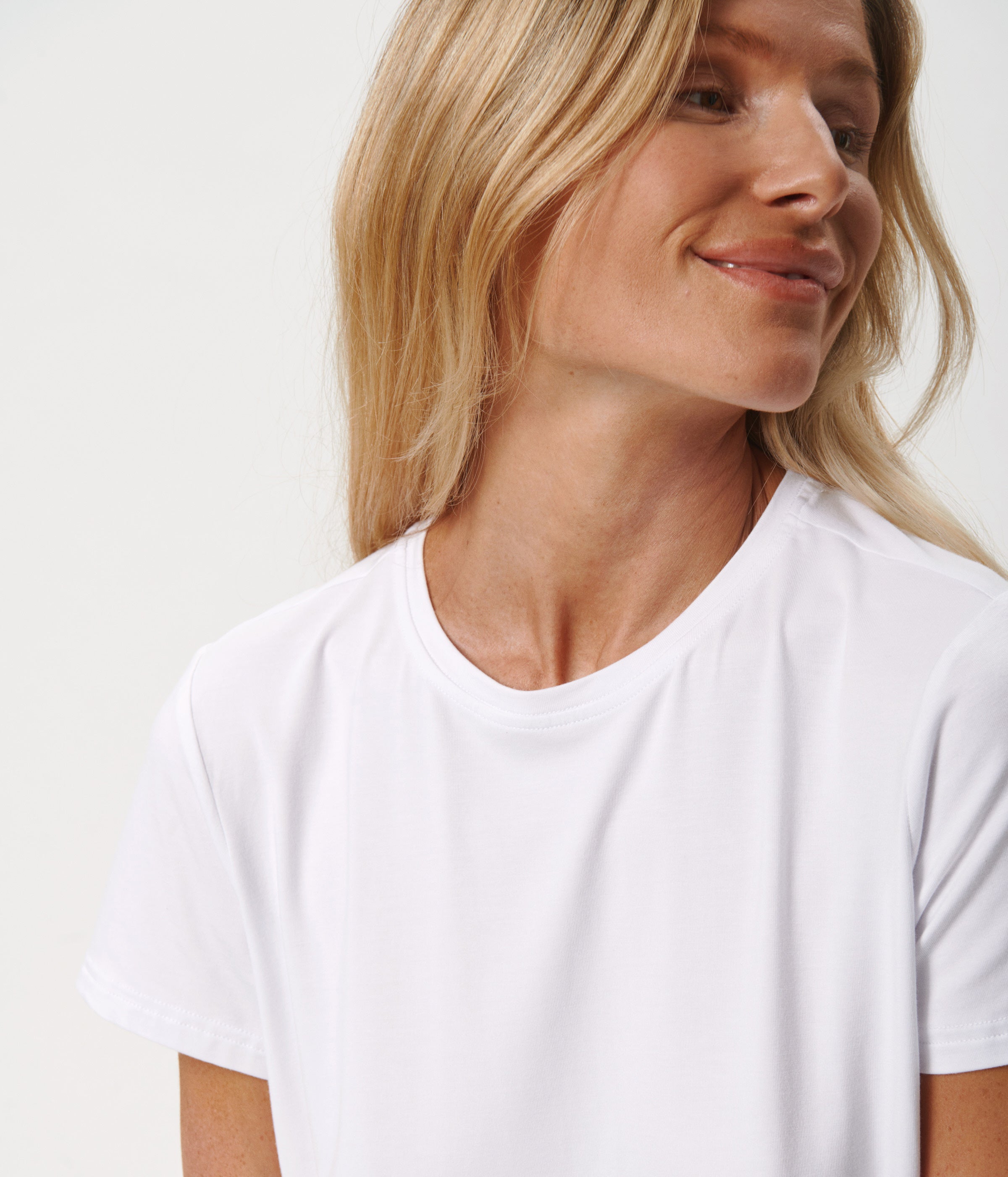 Denne hvide kortærmede bambus T-shirt til damer er fremstillet i den blødeste bambusviskose. Bambusfibrene gør T-shirten både åndbar og temperaturregulerende, så den er behagelig at bruge både om sommeren og vinteren.