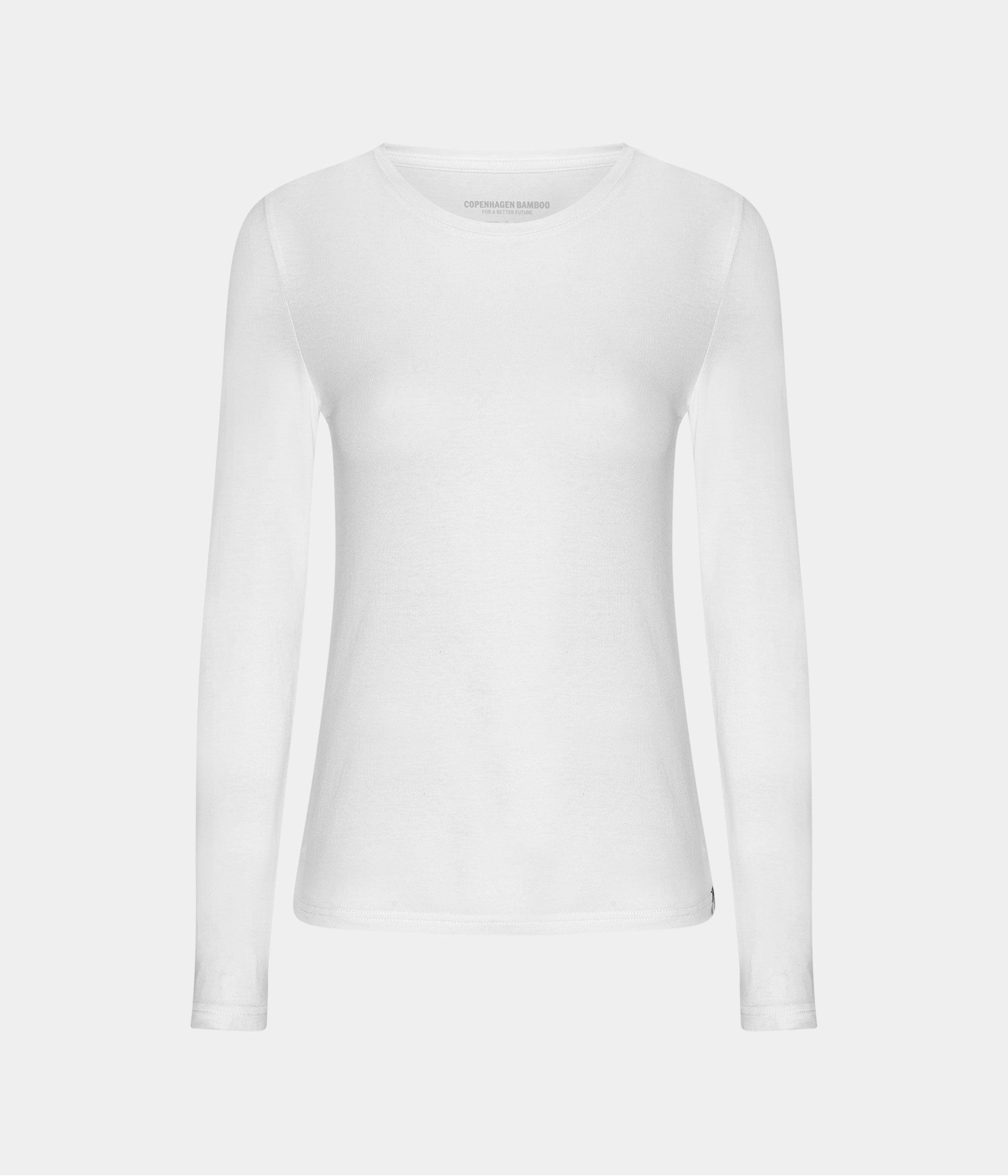 Denne hvide langærmede bambus T-shirt til damer er fremstillet i den blødeste bambusviskose. Bambusfibrene gør T-shirten både åndbar og temperaturregulerende, så den er behagelig at bruge både om sommeren og vinteren.